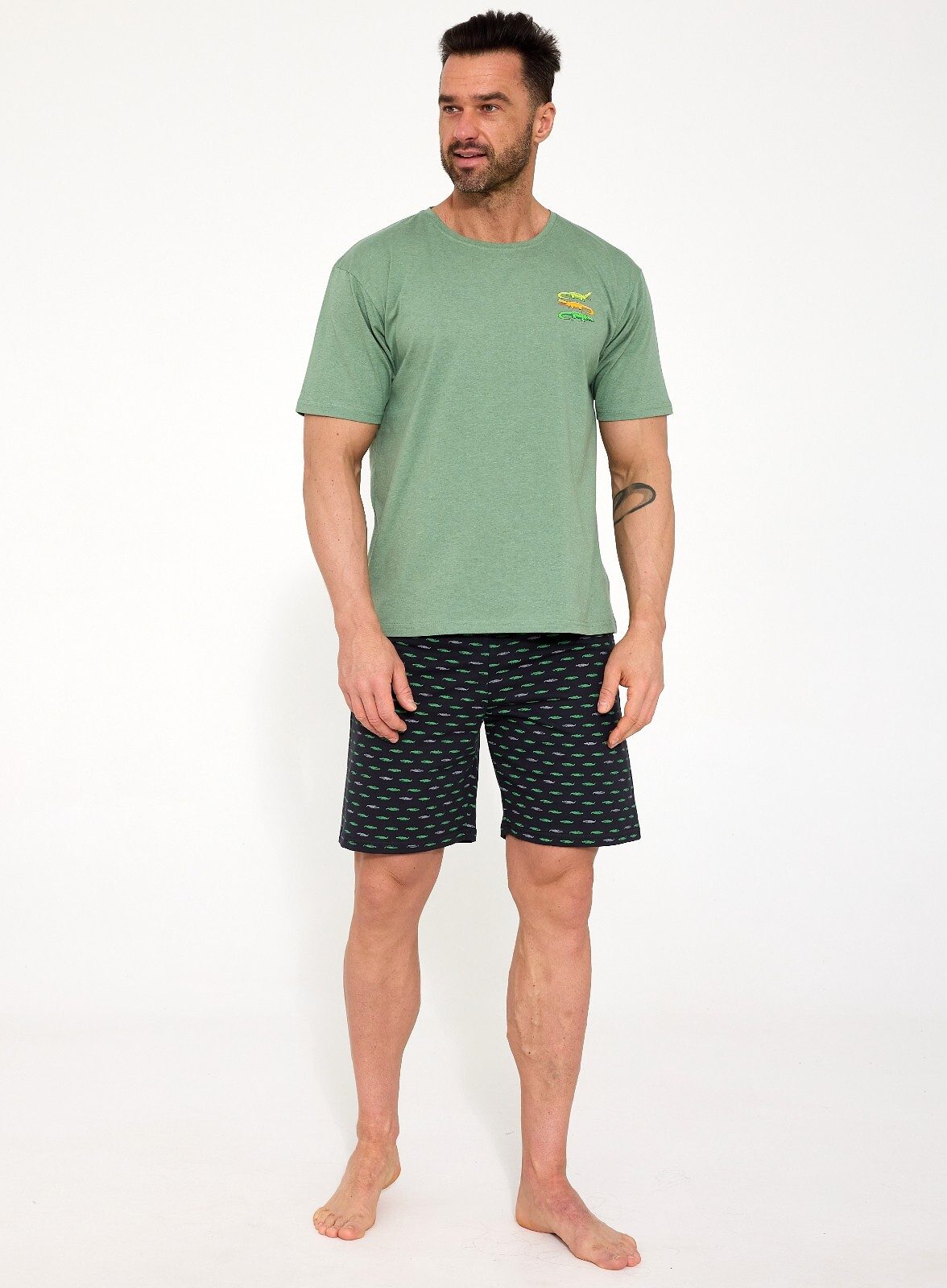 Vtipný a pohodlný set pro každý den. Toto pánské pyžamo kombinuje kvalitní materiály s hravým designem. Tričko s krátkým rukávem zdobí drobný barevný potisk krokodýlů, který doplňují vzorované šortky.